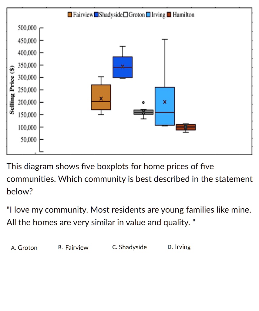Solved Fairview Shadysidedgroton Jlrvingt Hamilton 500 000 450 000 400 O00 350 000 300 000 250 000 1 200 000 4 150 000 1o 00o 50 000 This Diagram Shows Five Boxplots For Home Prices Of Five Communities Which Community Is